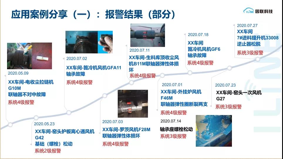 針對工廠級設(shè)備運維,因聯(lián)根據(jù)設(shè)備產(chǎn)線結(jié)合實際工況,搭建適合廠級設(shè)備的運維管理系統(tǒng),基于設(shè)備智能預(yù)警和診斷,減少巡檢人員數(shù)量,提高巡檢效率并提供備品備件預(yù)測管理。以典型的流程化行業(yè)水泥行業(yè)為例,覆蓋了石灰石場、生料制備、熟料燒成、水泥粉磨、水泥包裝和余熱發(fā)電的全工藝流程監(jiān)測方案,可提供從無線感知、有線感知,工藝、油液、溫度和圖像等監(jiān)測手段,到設(shè)備模型建立、數(shù)據(jù)算法訓(xùn)練、預(yù)警算法模型和診斷算法模型的設(shè)備預(yù)測性維護完整解決方案,從而實現(xiàn)對廠級客戶所有關(guān)鍵生產(chǎn)設(shè)備的完全覆蓋。